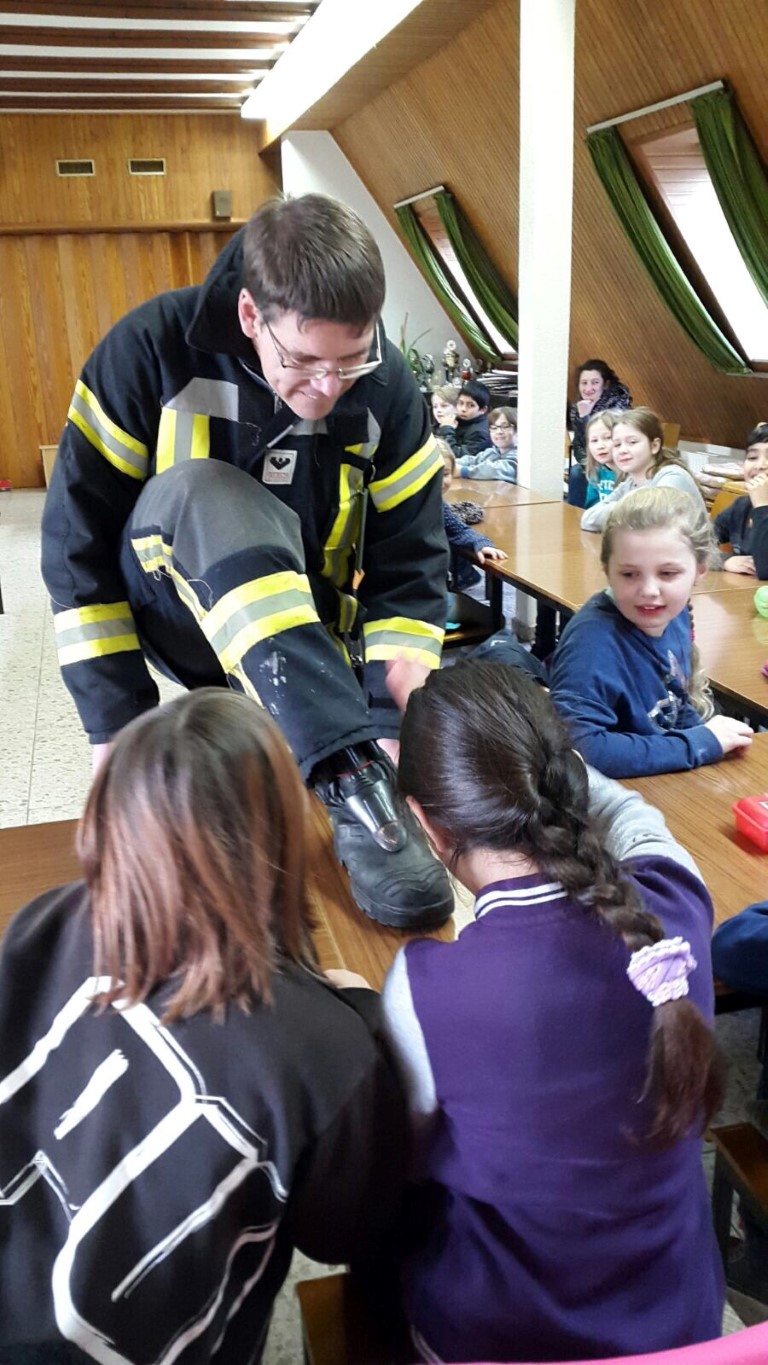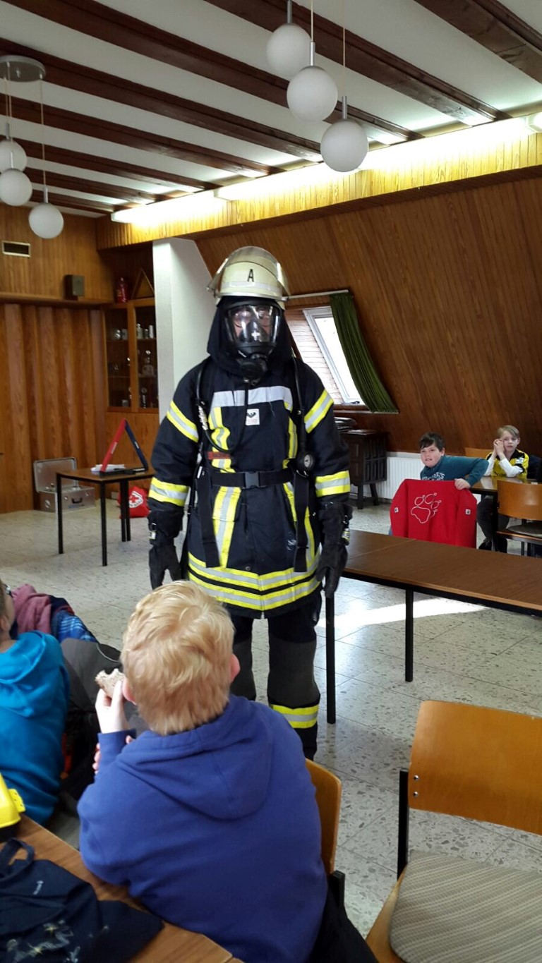 Dort zeigte er uns, was alles zu seiner Ausrüstung als Atemschutzgeräteträger gehört. In voller Montur war er gar nicht mehr wiederzuerkennen. Wir staunten nicht schlecht, als wir erfuhren, dass die Kleidung samt Sauerstoffflasche ganze 25kg auf die Waage bringt! Das entspricht etwa dem Gewicht einer Drittklässlerin.
