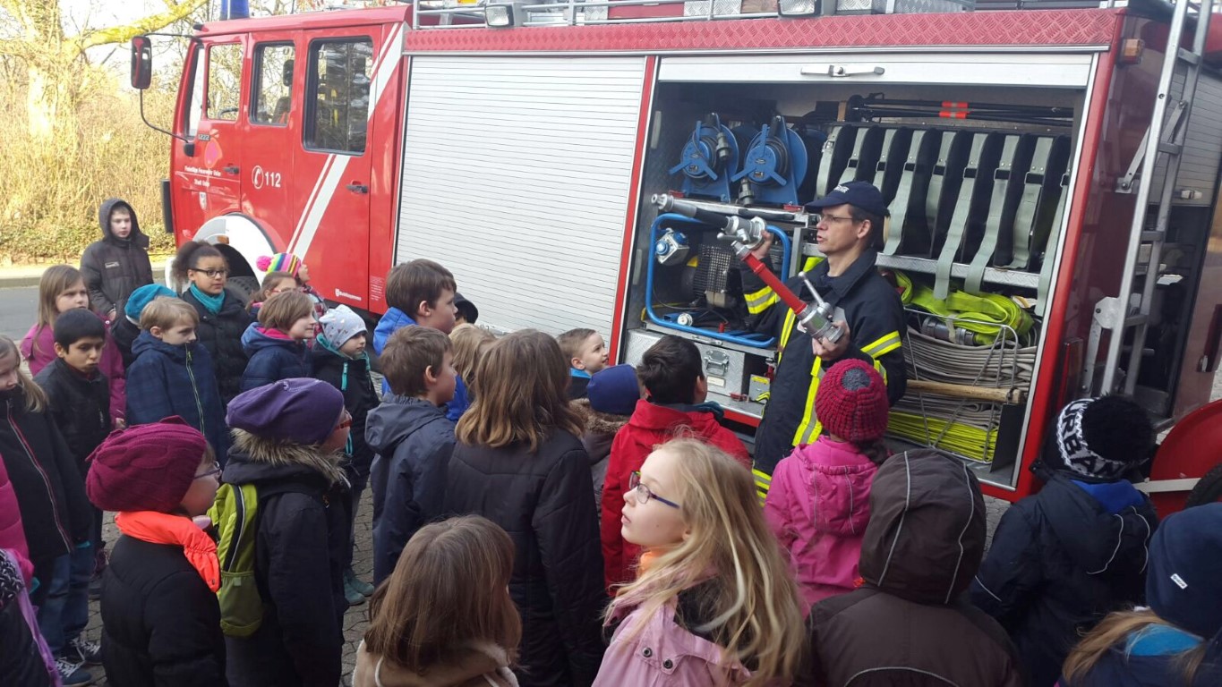 Im Rahmen der Unterrichtseinheit zum Thema „Feuer“ im Sachunterricht statteten unsere 3. Klassen der Freiwilligen Feuerwehr Uslar einen Besuch ab. Nach dem ersten Klingelzeichen machten wir uns zu Fuß auf den Weg. Am Feuerwehrhaus begrüßte uns Herr Rackwitz und schon ging es die Treppen nach oben in den Schulungsraum.